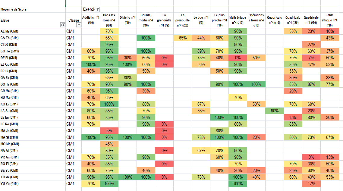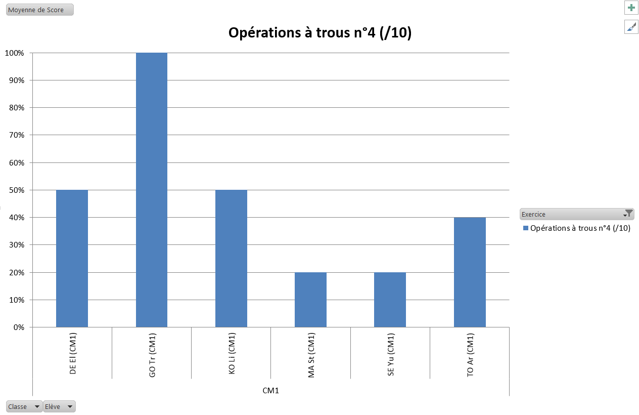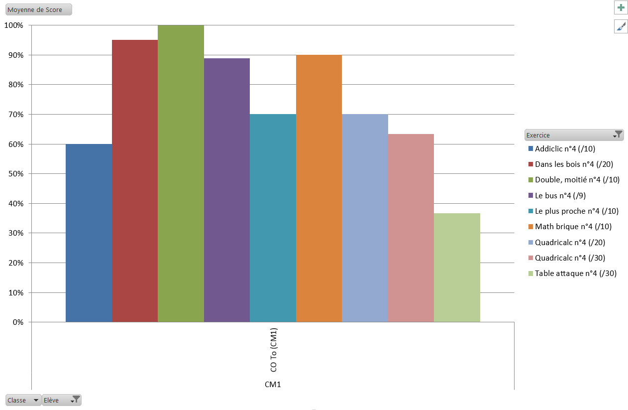Vous pouvez filtrer les élèves ou la classe ou les exercices dont vous voulez synthétiser les résultats (petits symboles dans les cases ad hoc)