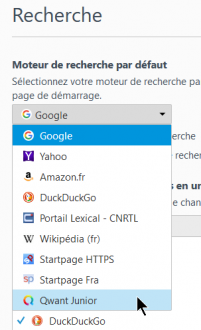 Dans la page qui apparaît, dans la partie ’Moteur de recherche par défaut’, cliquez sur la petite flèche noire au bout du moteur de recherche actuel. Choisissez Qwant Junior. Maintenant, les résultats qui s’afficheront si on fait une recherche dans cette boîte seront ceux de Qwant Junior.