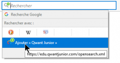 Vous pouvez également ajouter Qwant junior dans la boite de recherche qui se situe dans la barre d’outils. Lorsque vous êtes sur la page de Qwant junior, le petit plus vert indique qu’un moteur peut-être ajouté. Cliquez sur ce + et, dans la boîte qui apparaît, choisir ajouter ’Qwant Junior’.